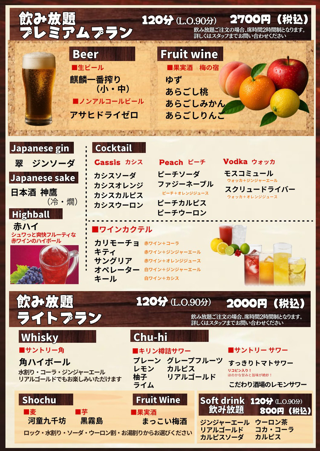 2時間飲み放題プラン(90分L.O./席時間2時間)